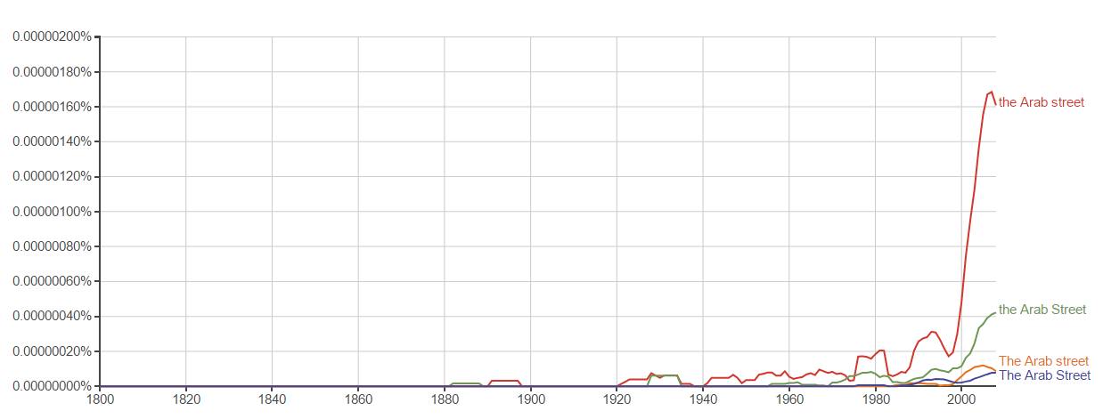 Christopher Hitchen's article about the vanishing of the term "the Arab street" in 2005 seems to have been premature: