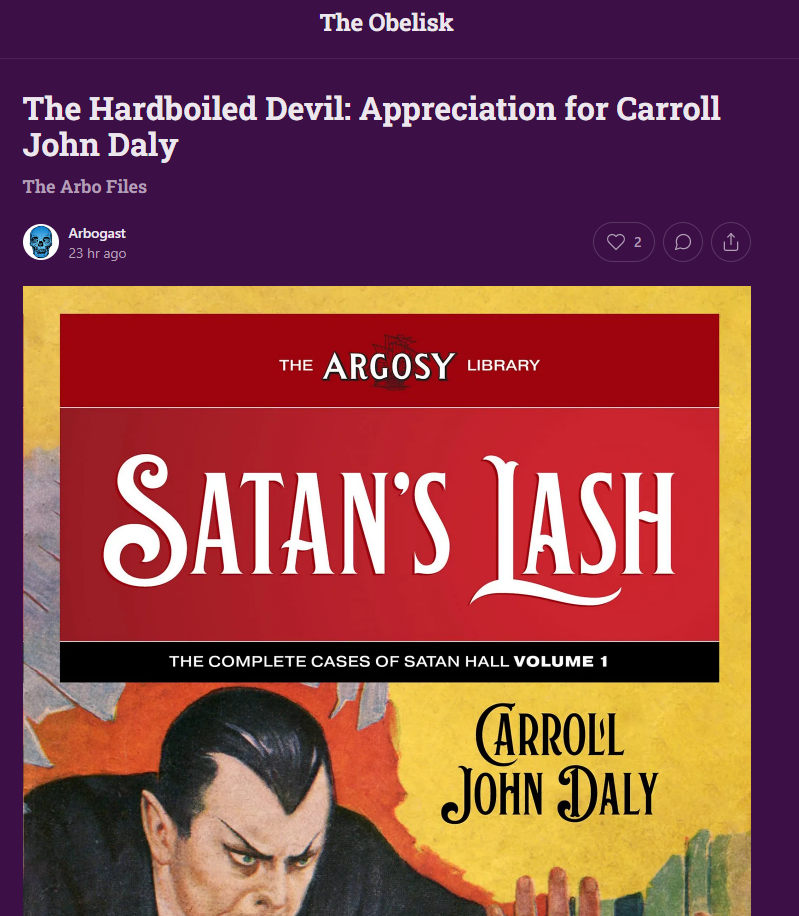 The Obelisk is one of my prime sources for information on the pulps, and this newsletter on Carroll John Daly is a great example. Dashiell Hammett is probably better known than Daly, but Arbogast makes a powerful case that he shouldn’t be, and also provides some fascinating links.