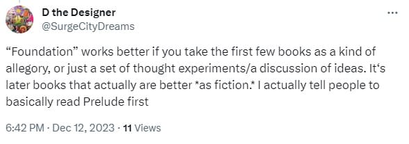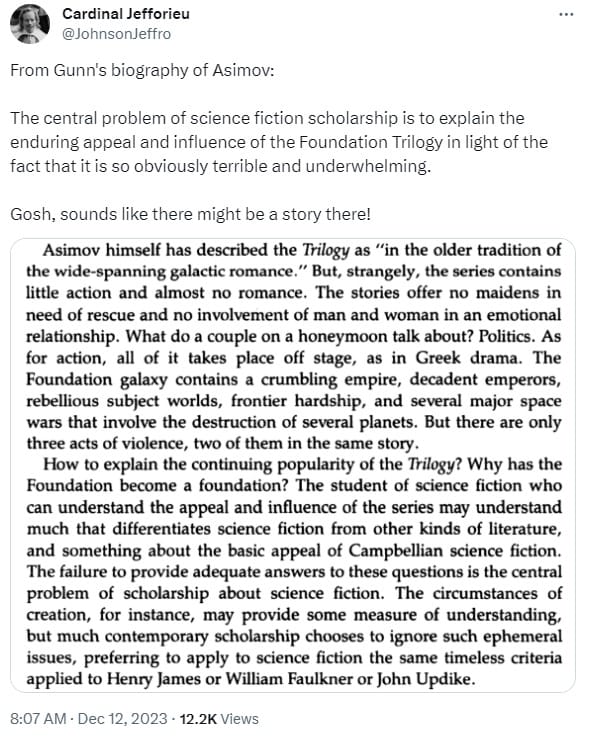 One of my main complaints in my review was that Foundation isn't a very good story. I was fascinated to discover that a subset of people who like it agree: