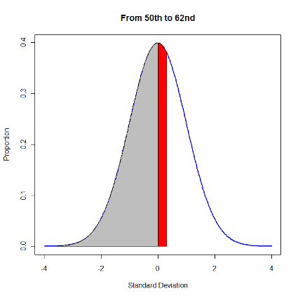 This is pretty good money we are talking about here too: $100-$200 an hour! I'd do it for a discount, only $75/hour. Probably pretty good work for unemployed ivory tower types. If you think about it in standard deviation terms, these companies claim they can move you up 1 SD (the SAT is normalized such that the standard deviation is 100 for each sub-test, and there are three sub-tests now). If we were talking percentiles, this would be equivalent to a move from the 50th percentile to the 84th percentile, or from the 84th to the 97.7th. For those of us who like pictures, see the images below: