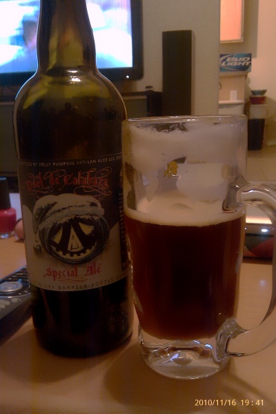 This beer shares sour notes with its close neighbor, the Flanders Red style. The sour flavor is foremost, but not overwhelming. Some fruity sweetness is also present. No noticeable hop flavor. Dark brown, with an impressively fluffy head. Aged in oak barrels.
