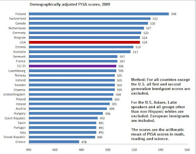 That isn't the headline you probably saw, but it really is true. The problem is that demography matters. Once this is understood, many things become clear. Thankfully, Tino at Super-Economy has done us the hard work of breaking down PISA scores by country of origin, comparing European Americans with Europeans.