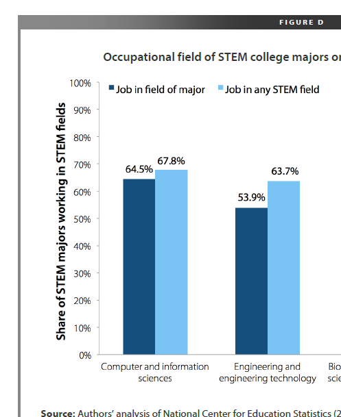 For STEM graduates, the supply exceeds the number hired each year by nearly two to one, depending on the field of study. Even in engineering, U.S. colleges have historically produced about 50 percent more graduates than are hired into engineering jobs each year.