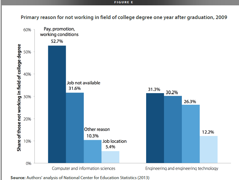 ln the computer and information sciences field, which is where nearly half of high-skill guest workers are employed, we see that about two-thirds of college graduates find jobs in their field 1 year after graduation, and of those who don't find a job, nearly half cite low pay and poor working conditions as the reason. For some of these, I would find it plausible that they weren't actually qualfied for the job. There is a skill distribution amongst college graduates, and not everyone is qualfied to do every job in this field. However, it does seem that the higher number of guest-workers in IT compared to engineering may be associated with a higher number of US college graduates being unable to find IT work because the pay is too low.