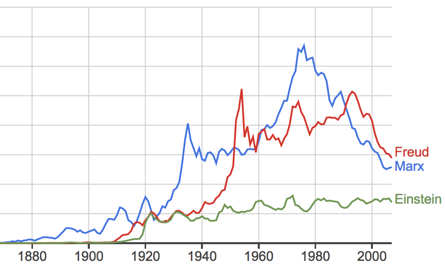 John Reilly used to say that the guiding spirits of the twentieth century were Freud and Marx and Darwin and Einstein. Steve Sailer only looked at 3 of the 4, so I made another chart with all of them. Darwin worked earliest, and so peaked earliest, but has maintained a steady presence ever since.