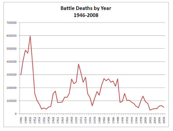 In fact, the number killed in battle has fallen to its lowest point in the post-World War II period, dipping below 20,000 a year by one measure. Peacemaking missions, meantime, are growing in number...A collaboration with Sweden's Uppsala University, [the 2004 Human Security Report] will conservatively estimate battle-related deaths worldwide at 15,000 in 2002 and, because of the Iraq war, rising to 20,000 in 2003. Those estimates are sharply down from annual tolls ranging from 40,000 to 100,000 in the 1990s, a time of major costly conflicts in such places as the former Zaire and southern Sudan, and from a post-World War II peak of 700,000 in 1951.