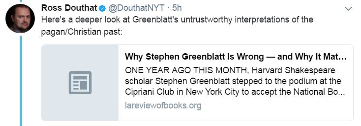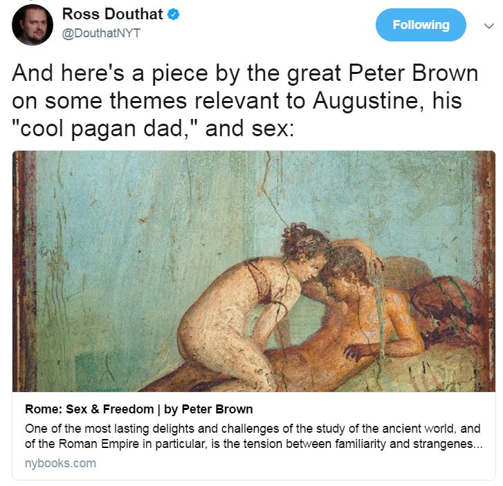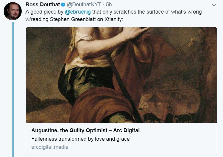 Ross Douthat posted a trio of links to articles about St. Augustine, in the service of criticizing Stephen Greenblatt's anti-Christian animus.