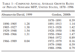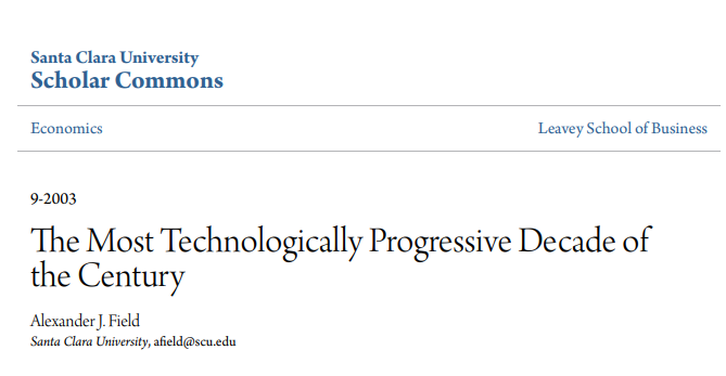But, you can also come at this from another angle. I always find it valuable to look for intersecting lines of evidence using difference approaches and bodies of knowledge. Alexander Field’s paper “The Most Technologically Progressive Decade of the Century” is one such differing approach, using economic data.