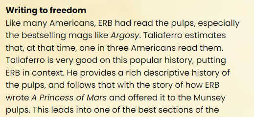 Like many Americans, ERB had read the pulps, especially the bestselling mags like Argosy. Taliaferro estimates that, at that time, one in three Americans read them.