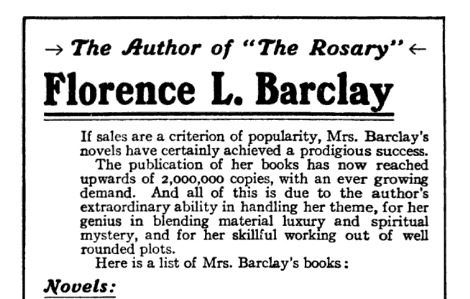 But on the other hand, books sold pretty well in 1910 too. Numbers are not readily available. I did find this about Florence L. Barclay, who wrote The Rosary, the best-selling novel of 1910. If you just multiplied the total sales by four, you could get a rough estimate of what that would be now. Not quite J. K. Rowling numbers, but I think just about any author would be satisfied with that performance.