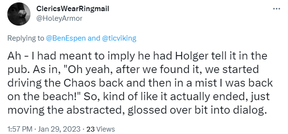 Twitter user ClericsWearRingmail asked a question about the literary device that Poul Anderson uses at the end of Three Hearts and Three Lions. An interesting question in and of itself, but the purpose here is for me to use that question to reflect on the death of the narrator in contemporary fiction.