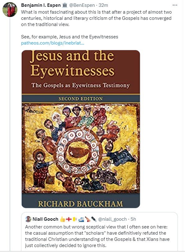 On Twitter this morning I commented on how historical and literary criticism of the Gospels has slowly come around to the traditional interpretation, although I suspect many people haven’t quite caught on to that yet.