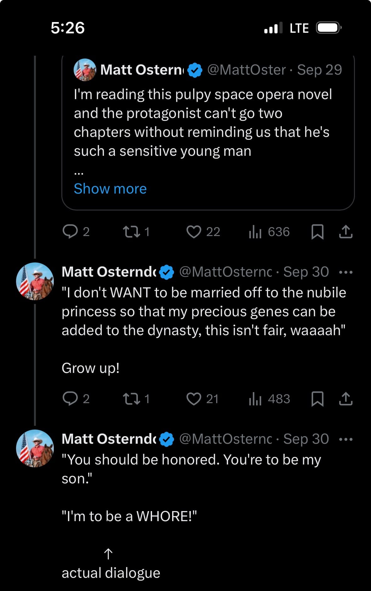 Hadrian Marlowe, on the other hand, is a whiny little bitch. I had a thread on Twitter/X last month where I defended Hadrian a little bit, as the part of the book the dialogue in the image above is taken from represents a significant betrayal of Hadrian.