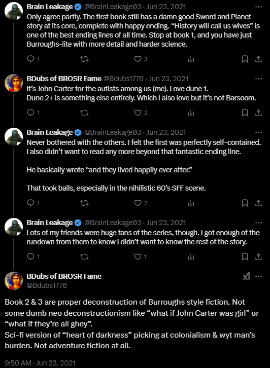 Empire of Silence is ideal for this because Ruocchio was very upfront that he wanted to tell his own version of Dune in his interview with Aaron Irber. In a similar way, Cole wrote an introduction to this edition of The Dream Lords where he cites first Edgar Rice Burroughs and then Frank Herbert as his inspiration. The books are even both written in the first person.