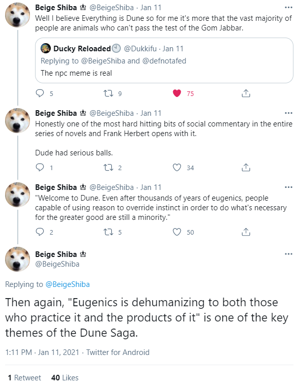 In particular, Dune and its sequels imagined what the world would be like if women exerted significant political power, through the Bene Gesserits and their generations-long program of manipulating the Emperor and the Great Houses to breed the Kwisatz Haderach.