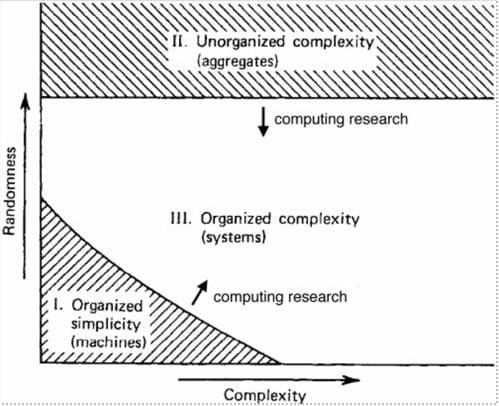 In the lower left is zone I, which is where we can understand our system analytically. We can just model the thing and solve the equations and out pops our answer. At the top is zone II, things that are too unorganized to solve analytically, and which we use statistics to understand. In the middle is zone III, organized complexity, which is too complex for analysis but has too small a sample size for Fisherian statistics methods.