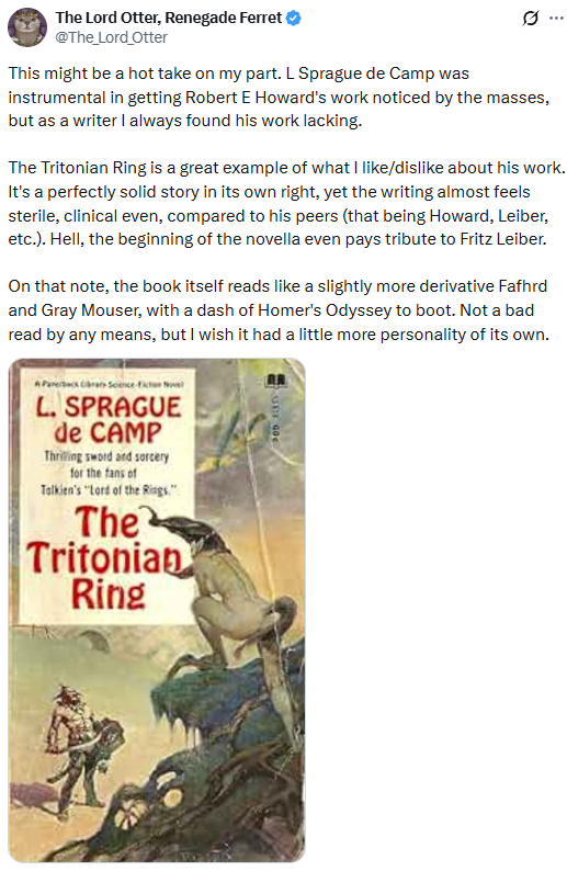 Twitter/X user The_Lord_Otter recently opined that L. Sprague de Camp was instrumental in preserving and promoting the work of Robert E. Howard, but that de Camp's own work was merely okay. I endorse this view, but I wanted to take a tangent into what I think de Camp was really good at doing in his stories.