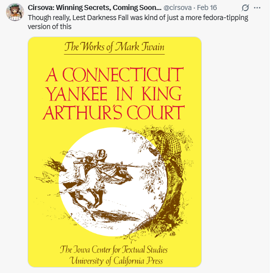 Next, let us consider Lest Darkness Fall. de Camp's story of a modern man thrown back in time is in conversation with Mark Twain's A Connecticut Yankee in King Arthur's Court, but not simply an imitation of that. Twain's book is a satire, with the books [or perhaps the audience] of Sir Walter Scott as a likely target. While de Camp is also engaged in a demythologized portrayal of the past, Lest Darkness Fall is firmly in the fannish technologically-oriented mid-twentieth century science fiction oeuvre.
