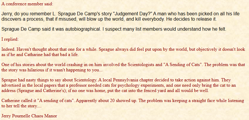 Which brings me to a funny story from Jerry Pournelle about the de Camps. A correspondent wrote to Jerry asking about de Camp's short story "Judgment Day", which is a nerd revenge tale.