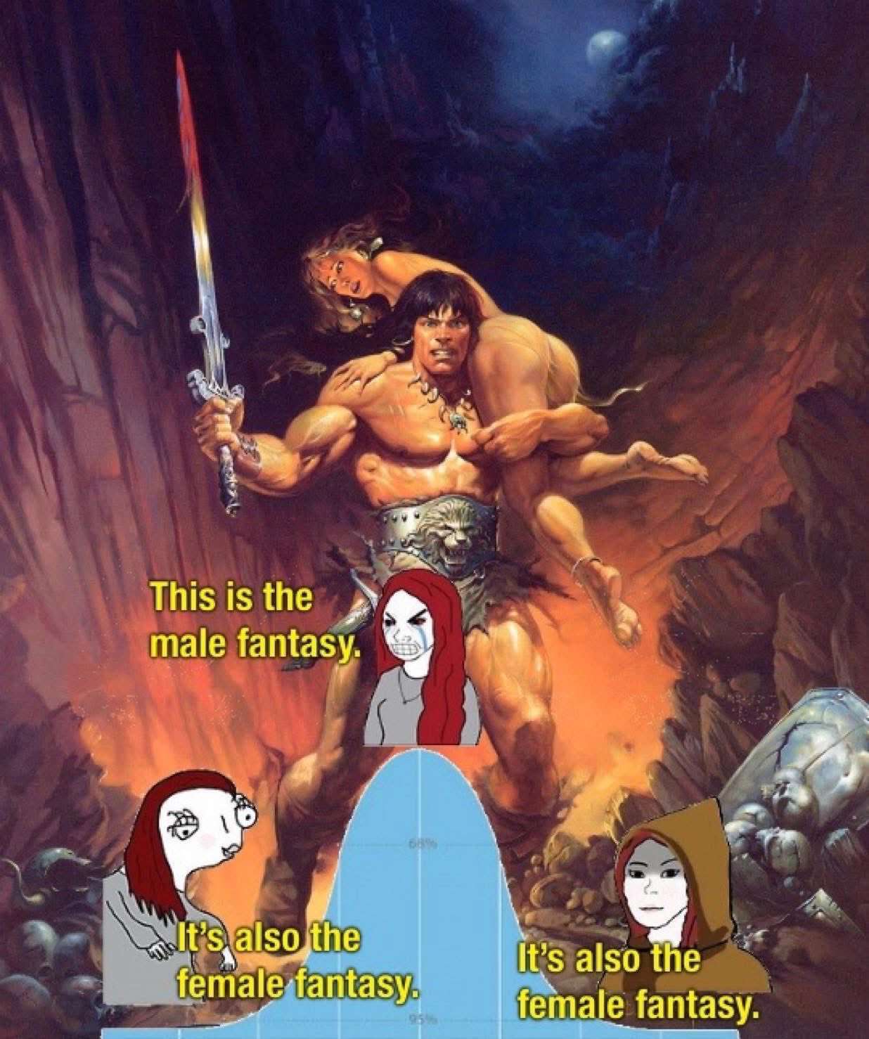 If I were to propose an addition to Northrop Frye's structural analysis of literature, it would be to add in a continuum of plots that preferentially appeal to men or women. There are some pretty clear cases where books will skew almost all one way or the other. Genre literature is often highly gendered in this way. Take Forgotten Ruin or The Song of Roland versus Twilight or the Hunger Games.