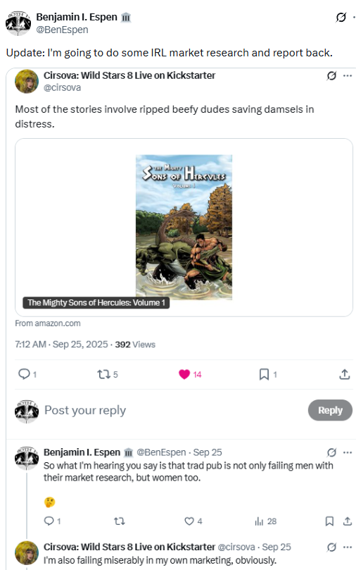This is excellent reinforcement to the idea that covers matter very much for selling a book, and that covers ideally have some relationship to what is in the book. But it also tells us that some market segments will absolutely have a negative reaction to a cover. If you really wanted to try to market the Mighty Sons of Hercules to women, it would need an alternate cover for that purpose.