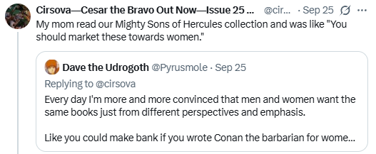 In September I was talking with Alex of Cirsova Publishing about men's and women's tastes in fiction, and Alex mentioned that his mother had suggested marketing the Mighty Sons of Hercules short story collection to women.