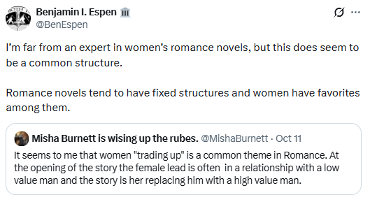 My wife has what I consider to be mainstream book tastes. Her favorite book is Brideshead Revisited. She likes romance novels, from the classics like Pride & Prejudice to modern renditions like Beach Read. However, she is not interested in the degenerate trash that has a surprising market penetration with women.