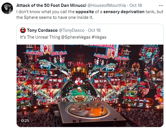 The new music venue in Las Vegas called The Sphere [although not Crichton's Sphere, a good deal on Amazon right now] was described by one of my Twitter mutuals as "the opposite of a sensory deprivation tank".