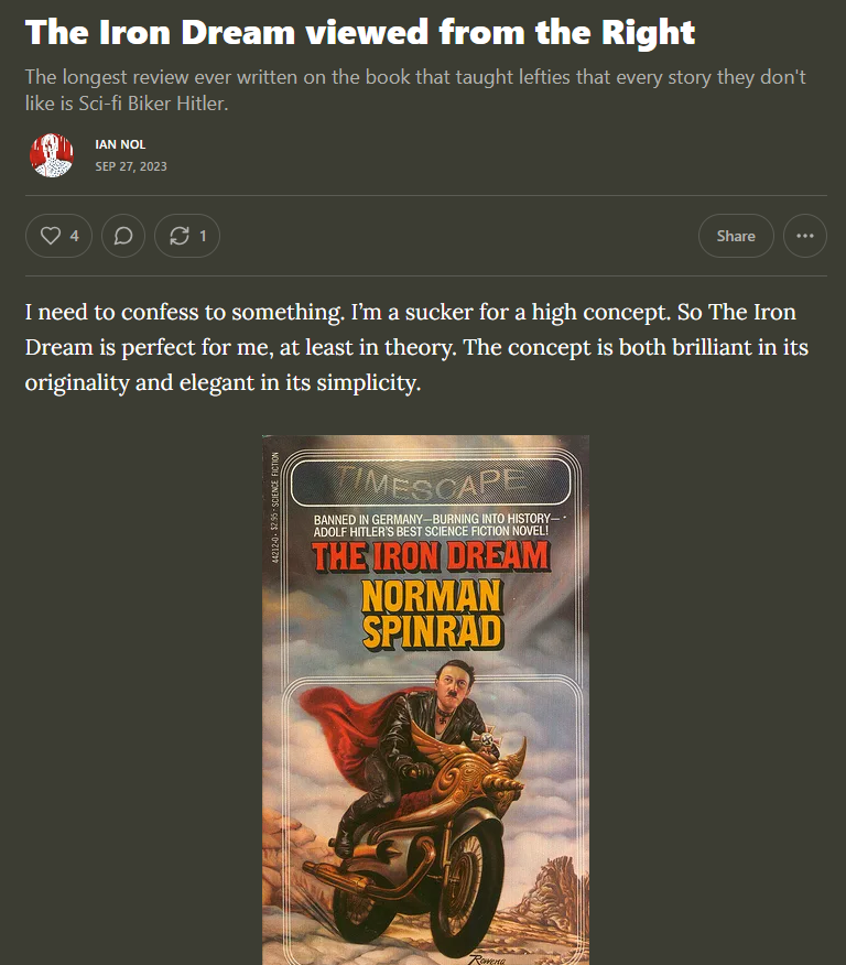 Norman Spinrad is, or at least was when he wrote The Iron Dream, “that guy.” The one who says that evil races in fantasy represent minorities. The one who says that Goblin Slayer is a “Nazi show.” That guy. This was his main motivation for writing The Iron Dream. He thought that the pulp novels of his day were full of fascist and racist dogwhistles, and this was his way of critiquing them.