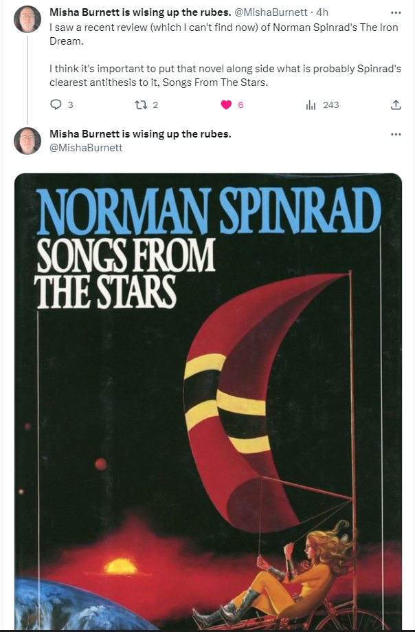 Misha Burnett tweets about the book Spinrad wrote as the antithesis to The Iron Dream, Songs from the Stars.