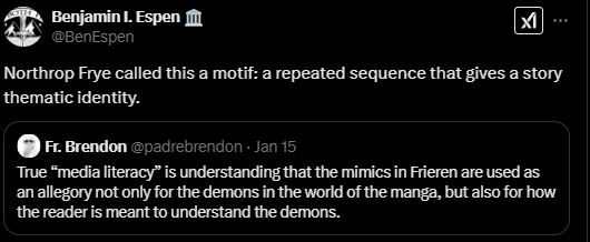 Nick Enlowe offers us a series on the surprising depth of Frieren. The surface level story of Frieren is very simple, but the amount of commentary it will bear is considerable. Here, Enlowe is talking about motifs, repeated elements that give a work thematic unity. In this case, jewelry and statues are used as tangible reminders of the value of preserving the past.