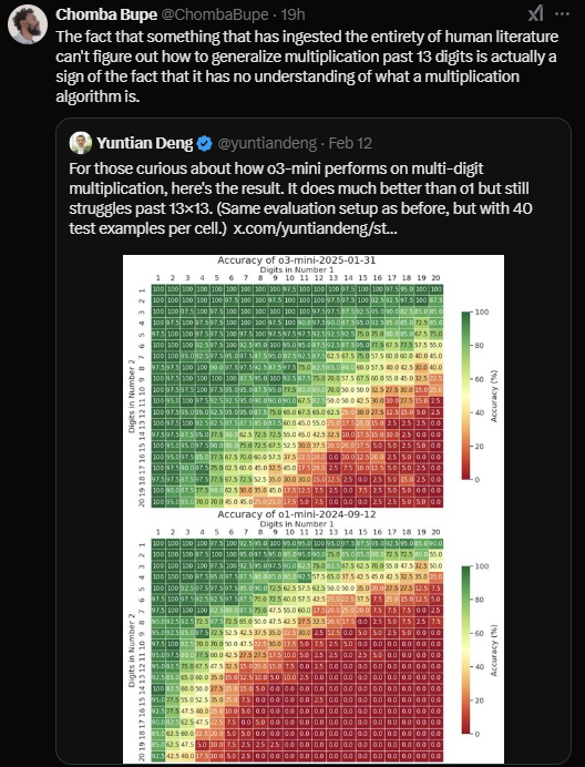 One of the reasons I hate the term AI is that it prevents people from thinking about what algorithms like O3-mini actually do. It is a very complicated autocomplete text function, but it has no ability to generalize anything. If it did, it could flawlessly perform any multiplication desired.