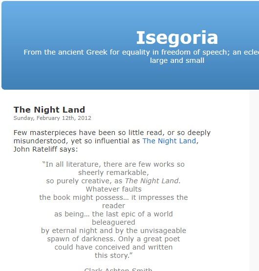 Friend of the blog Isegoria writes about the influence of The Night Land by William Hope Hodgson.