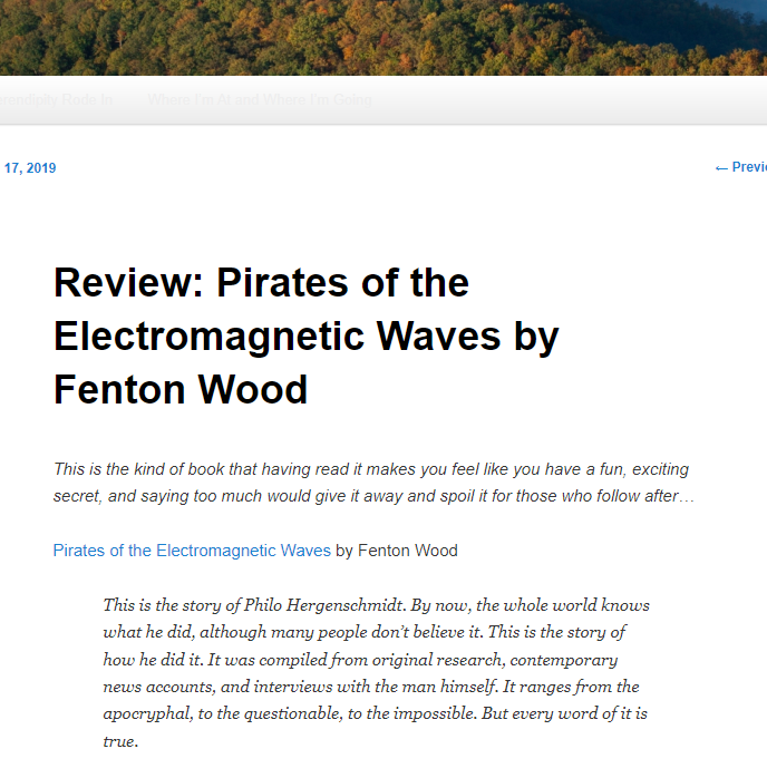 Friend of the Blog Neovictorian reviews Fenton Wood's Pirates of the Electromagnetic Waves. One of my all time favorite books.
