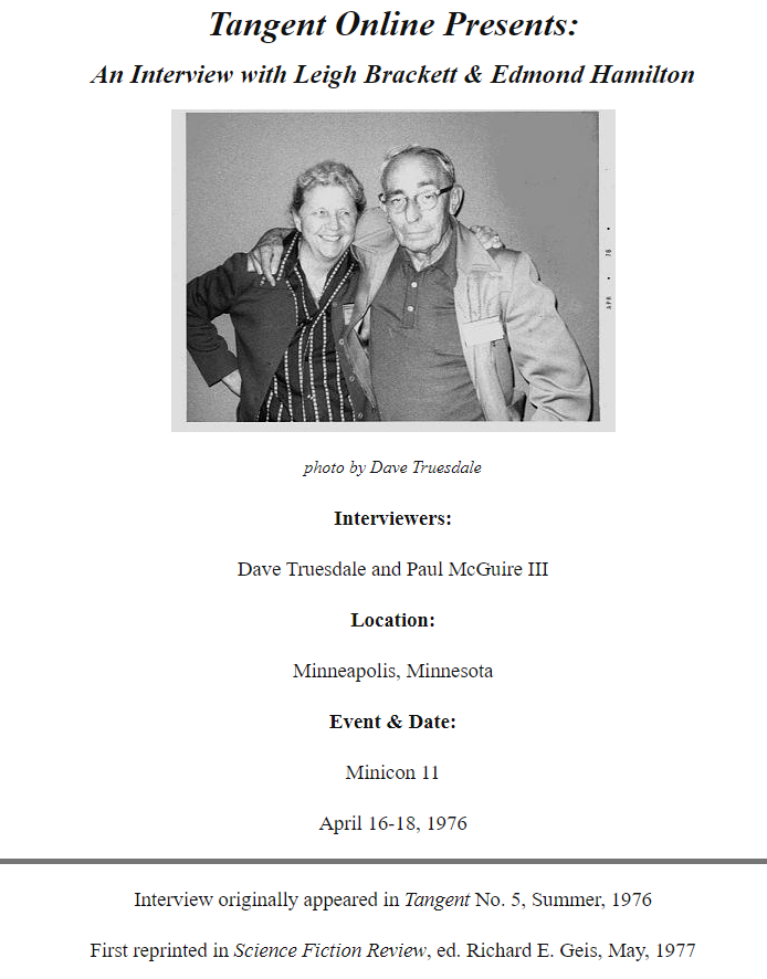 This interview with Leigh Brackett and Edmond Hamilton has some great history in it. Brackett talks about being a woman in science fiction, working with famous actors and directors, and has some anecdotes about other writers. I also get the impression that Brackett and Hamilton were very warm and genuine people, who would have been a real pleasure to know in person.