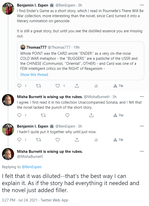 Also consider, 1977 was the year "Ender's Game" was published as a short story. While hindsight is 20/20, "Ender's Game" is way punchier than the stuff in Wollheim's 1977 anthology. And not only is it better than these stories, it was Card's first published story. It is hard to avoid the impression that this collection was in large part assembled because of personal ties rather than actual literary quality.